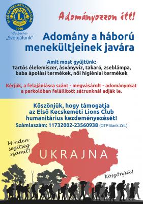 Az Első Kecskeméti Lions Club gyűjtést szervez a kecskeméti Auchan áruház parkolójában 2022. április 2-án 9:00 és 15:00 óra között az ukrán menekültek részére.